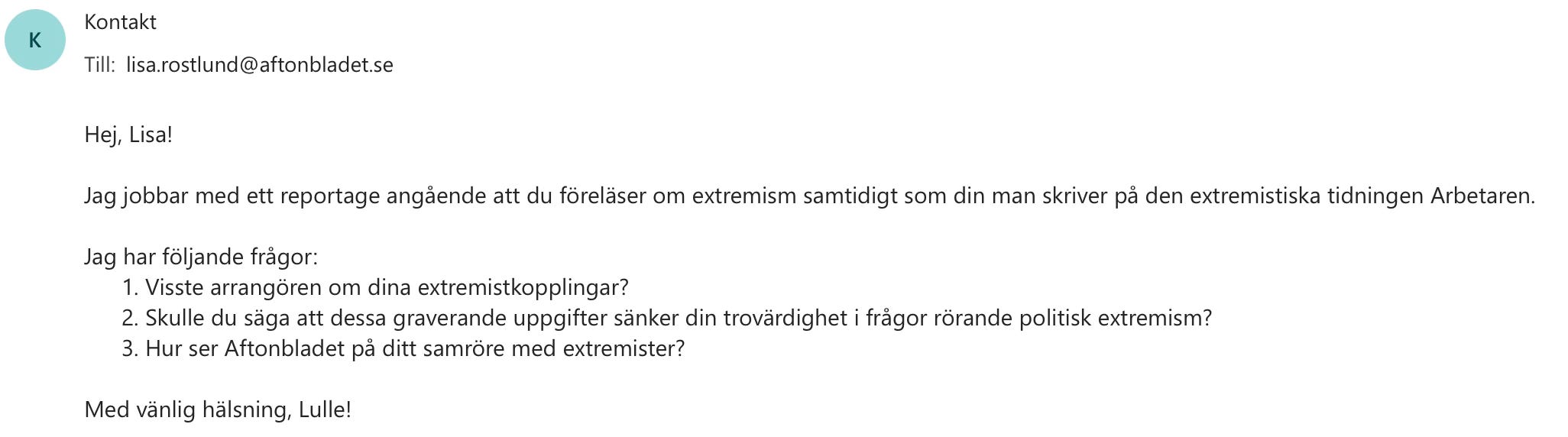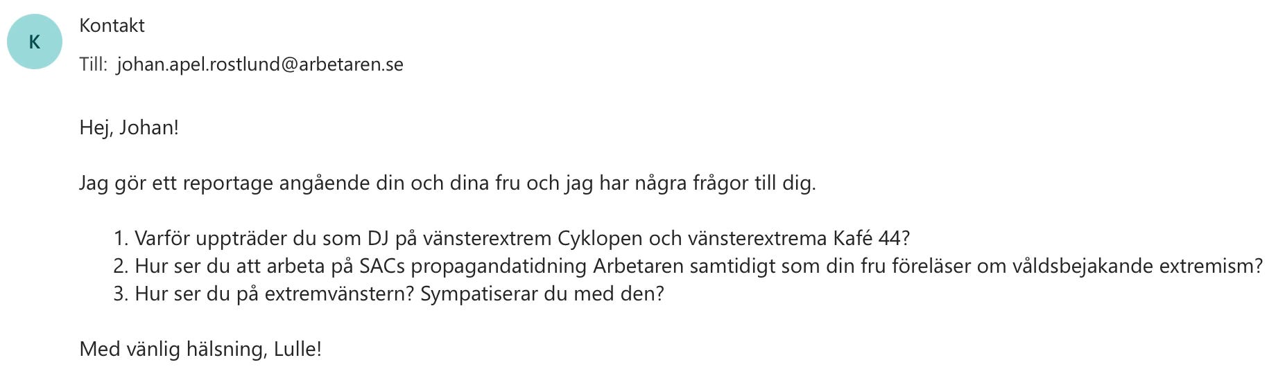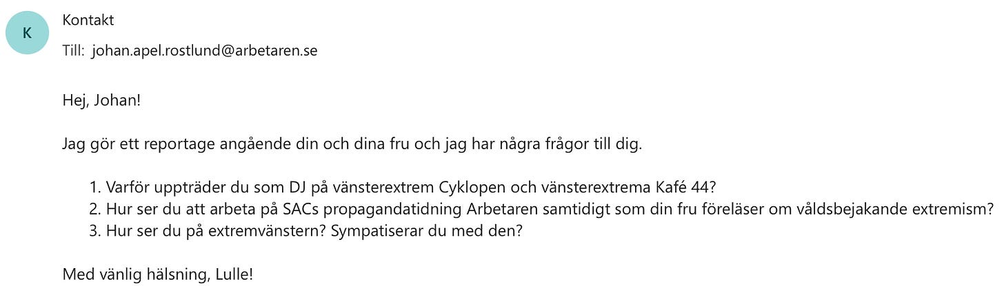 Något som sänker Lisas trovärdighet i frågan om våldsbejakande extremism rätt så rejält är att hon själv är gift med Johan Apel Röstlund, som är “reporter” på vänsterextrema och våldsbejakande SACs propagandaorgan, Arbetaren.