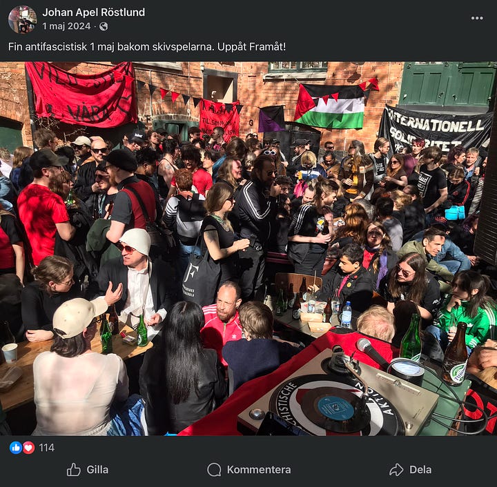 Johan Apel Röstlund arbetar till vardags, som sagt, på det syndikalistiska propagandaorganet Arbetaren. Men på fritiden är han DJ. Han har dj:at på extremvänsterns främsta samlingspunkter i Stockholm, Cyklopen och Kafé 44. Den senare så sent som 2024.