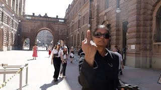 Helt plötsligt dyker det upp en dam, med en LVU-kritisk skylt, som ställer sig utanför Riksdagen. Jag börjar filma henne. Vilket gör att hon blir väldigt förbannad. Hon börjar peka finger mot mig samt skrika att jag ska avlägsna mig från platsen.