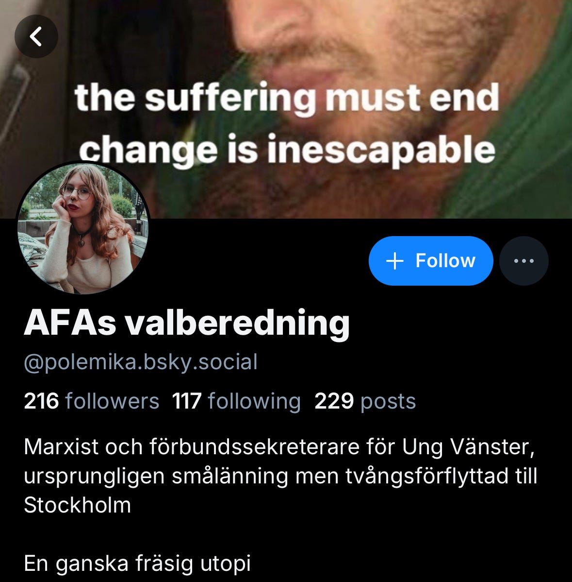 Mika är aktiv på vänsterns ekokammare Bluesky, under namnet “AFAs valberedning”.